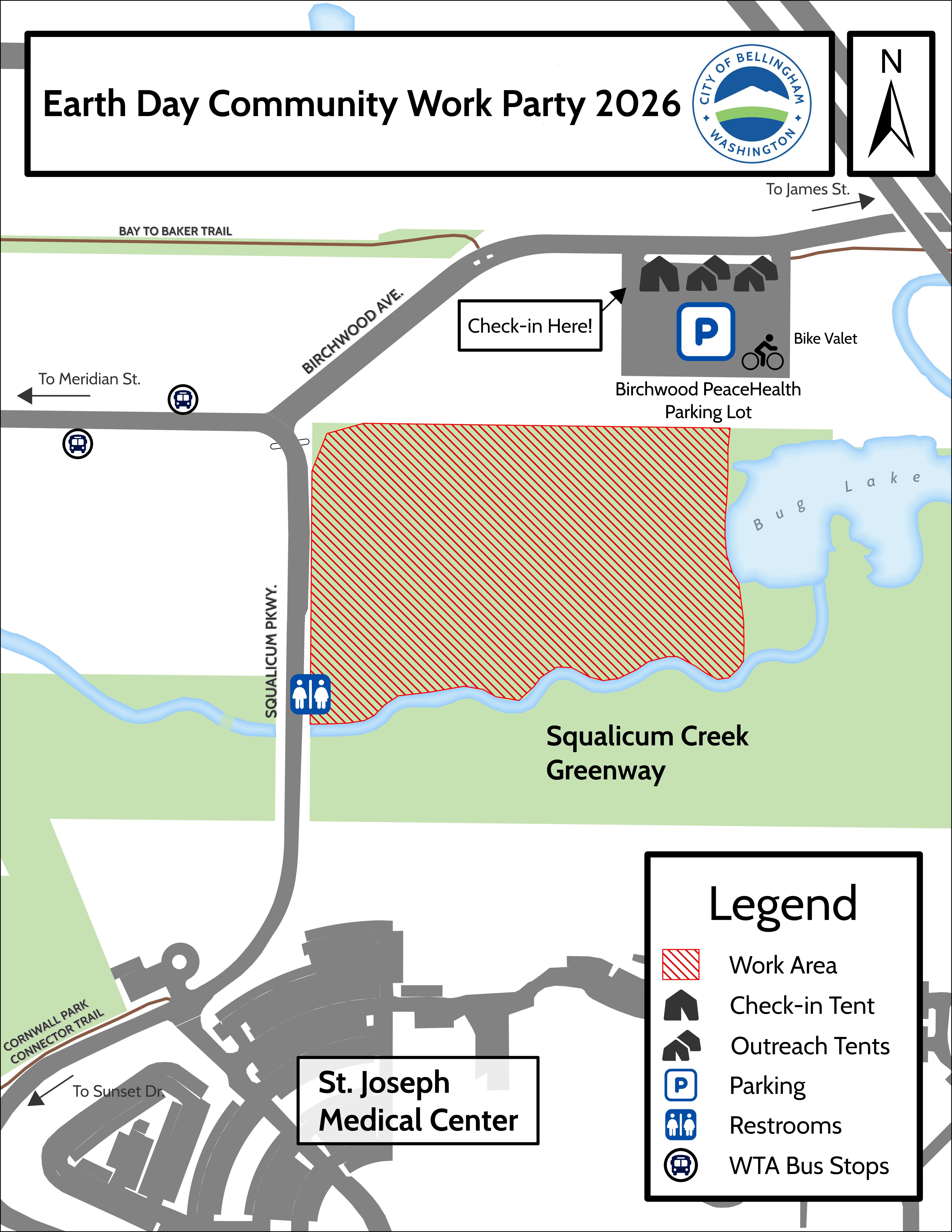 - Where to meet: Please meet at the Birchwood PeaceHealth Parking Lot located off of Birchwood Avenue. Parking, a free bike valet, and the sign-in tent will be located here. Event staff will then lead groups of volunteers to the work site. Thank you to PeaceHealth for providing access to this parking lot for our event!